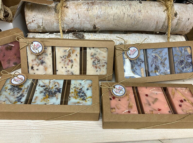There are 3 pink/coral rectangular wax starters. All are packed in an attractive triptych style box, ready for gift giving.