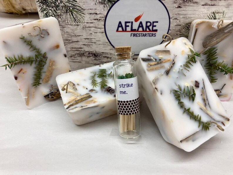 12 rectangle fire starters consist of wax, wood & fresh greenery found around the rural woods & farmlands of Northwest New Jersey. Comes with a charming glass vial filled with wooden matches.