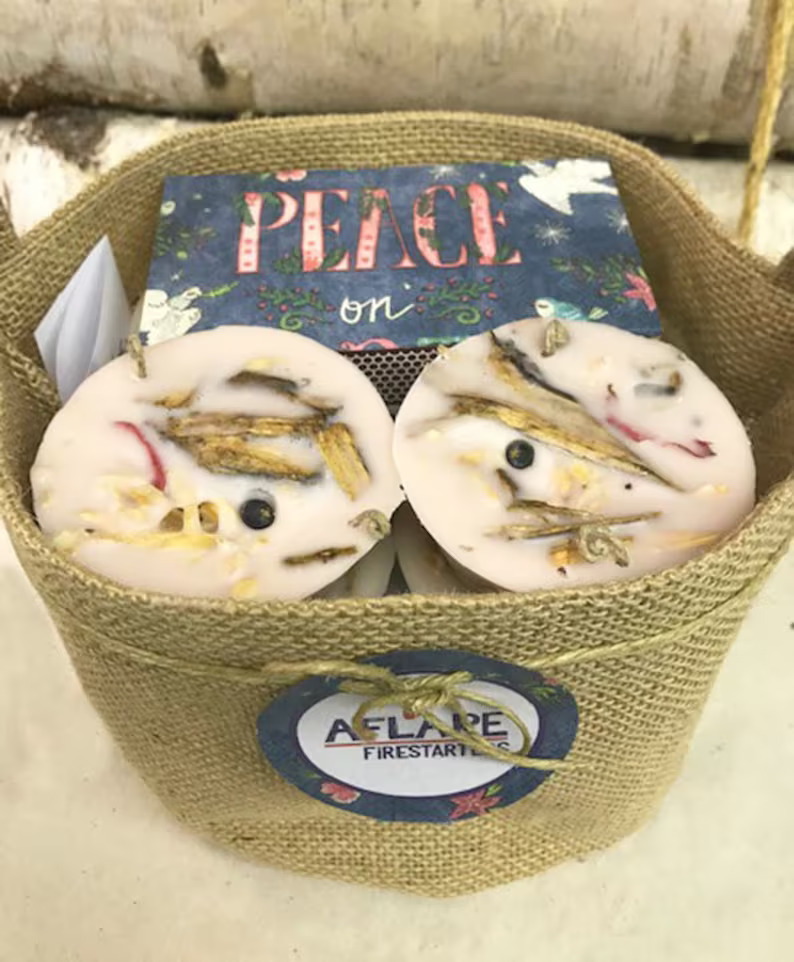 Keep the home fires burning with these winter cupcake style fire starters by AFlare. Attractive sitting on the hearth, fire starters come in a rustic burlap bag. Comes with a box of matches – a beautiful illustration of a peace dove. All natural elements are found on and around my non- working farm property in Sussex County N.J.