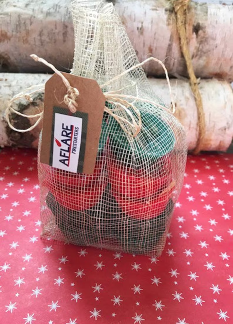 Keep the home fires burning this winter with these festive mini red & green firerstarters . Firestarters come in a natural mesh drawstring pouch. Makes a great holiday housewarming gift for woodstove and fireplace loving homeowners!