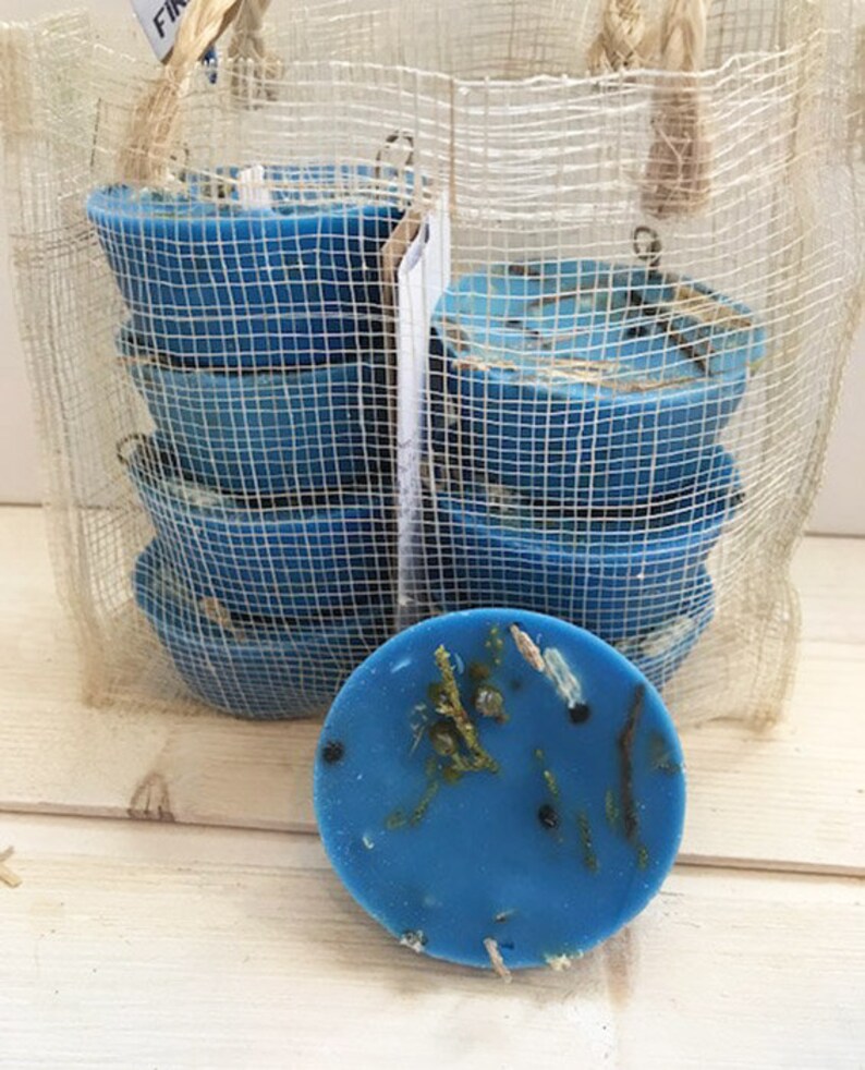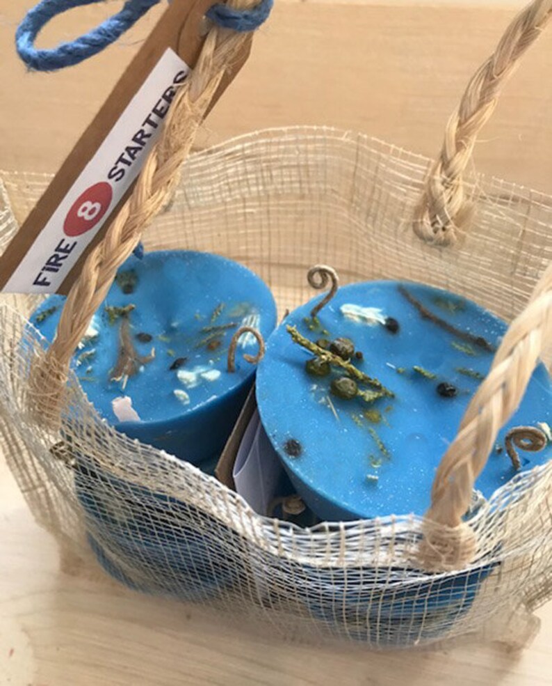 A natural woven hemp tote bags holds 8 blue/teal colored cupcake style fire starters. Makes a great housewarming gift for woodstove and fireplace loving homeowners! An attractive addition to the hearth area in the home. Bag is sustainable and re-usable.