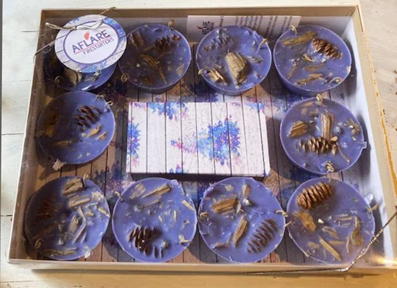 AFlare (TM) signature product is a gift set of 10 fire starters with a box of decorative matches. These are a dusky purple color, adorned with pinecones found near my home. Matchbox has beautiful abstract blue & purple trees on a rustic wood background.